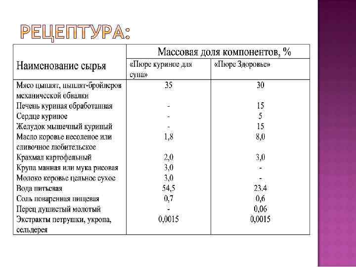 1. 2. «Пюре куриное для супа» - для детей старше 1 года и диетического питания. «Пюре Здоровье» -для детей школьного возраста.