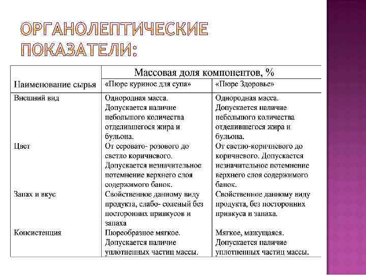 Консервы фасуют в металлические банки, изготовленные из белой жести горячего или электролитического лужения или алюминиевой лакированной ленты защитными покрытиями. 2. На этикетке банки помимо установленных обозначений, должно быть указано: «Пюре куриное для супа» - для детей старше 1 года и диетического питания. Химический состав: Белки – 5% Соль поваренная- до 1% Жиры – до 10% Энергетическая ценность – 101 ккал. Одобрено Министерством Здравоохранения СССР. 1. «Пюре Здоровье» – для детей школьного возраста. Состав: Мясо и субпродукты куриные, масло сливочное, крахмал картофельный , специи. Белки - 10% , Соль – до 1%, Жиры - -15%, Энергетическая ценность – 168 ккал. Одобрено Министерством Здравоохранения СССР.