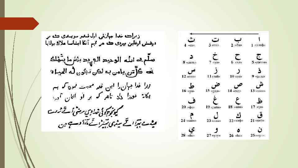 Арабский алфавит Ара бский алфави т — алфавит, используемый для записи арабского языка и некоторых других языков, в частности фарси, пушту, урду и некоторых тюркских языков. Арабское письмо произошло от набатейского письма, развившегося из арамейского письма, которое в свою очередь восходит к финикийскому письму. Используется в качестве официального в 22 государствах. Кроме арабоязычных народов, оно с некоторыми модификациями применяется у народов Афганистана, Индии, Ирана и Пакистана, также распространено в Синьцзян-Уйгурском автономном районе КНР, Бирме (Аракан), в Камбодже и южных районах.