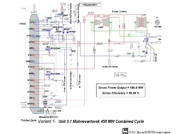 Консорциум по строительству бл. 3. 1 Нижневартовской ГРЭС «под ключ» Энергоблок Нижневартовской ГРЭС, бл. 3. 1, 3. 2 Газовая турбина M 701 F 4 с компрессором на степень сжатия 18 , с номинальной температурой газов перед турбиной 1400 OC и около 600 OС выхлопных газов, с возможностью генерации в КУ перегретого пара высоких параметров. Умеренная металлоёмкость 1, 3 кг/к. Вт. и соответственно низкая удельная стоимость 300 $/к. Вт. Малотоксичная кольцевая камера сгорания с «сухим» подавлением окислов азота. Котлы-утилизаторы КУП-400 с промежуточным перегревом пара и тремя уровнями давлений ( 13, 2; 3, 2 и 0, 5 Мпа ) обеспечивают глубокое охлаждение выхлопных газов до 90 OС. Скользящее давление пара в контурах котла –утилизатора обеспечивает высокую тепловую экономичность при изменении нагрузки от100 до 60 %. Трёхцилиндровая паровая турбина типа К-320 -12, 8 трёх давлений используемого пара с промежуточным перегревом и конечным давлением пара 0, 022 к. Гс/см 2 развивает мощность равную 320 МВт.