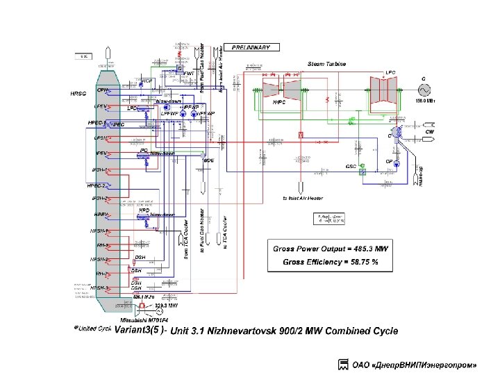 Энергоблок Нижневартовской ГРЭС, бл. 3. 1, 3. 2 Баланс-схема ПГУ-1000 для среднегодового режима работы Проектные параметры тепловой схемы ПГУ-1000 с ГТ мощностью 315 МВт и паровой турбины К-320 -12. 8 для условий работы при среднегодовой температуре наружного воздуха -3. 3°С и температуре охлаждающей воды 5 °С.