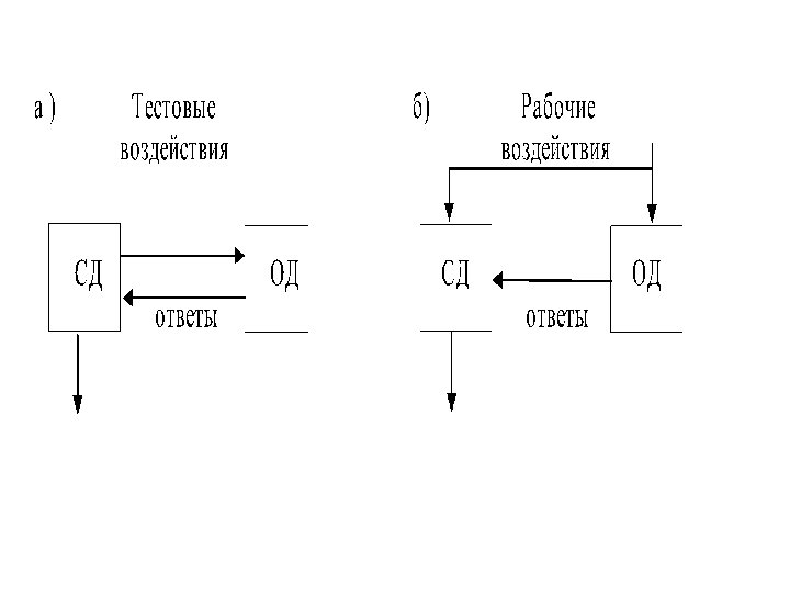 Рис. 1. 1, а), б), в) и г) соответствуют задачам проверки исправности, работоспособности, правильности функционирования и поиска неисправностей. Диагностирование осуществляется с помощью тех или иных средств диагностирования (СД). Выделяют встроенные и внешние СД. Встроенное средство диагностирования (контроля) – средство диагностирования (контроля), являющееся составной частью объекта. Внешнее средство диагностирования – средство диагностирования (контроля), выполненное конструктивно отдельно от объекта. Взаимодействующие между собой ОД и СД образуют систему диагностирования. Процесс диагностирования, в общем случае, представляет собой многократную подачу на ОД определенных воздействий (входных сигналов) , многократных измерений и анализа ответов на них. Воздействия могут формироваться СД либо определяться непосредственно алгоритмом функционирования ОД. Различают системы тестового и функционального диагностирования. Особенность первых состоит в возможности подачи на ОД специально организованных (тестовых) воздействий от средств ОД. В системах второго типа диагностирование ведется на рабочих воздействиях, предусмотренных рабочим алгоритмом функционирования ОД. На рис. 1. 2, а) и б) приведены обобщенные функциональные схемы систем тестового и функционального диагностирования соответственно. Системы функционального диагностирования обычно обеспечивают контроль ОД в процессе его применения по назначению, тестового при производстве и