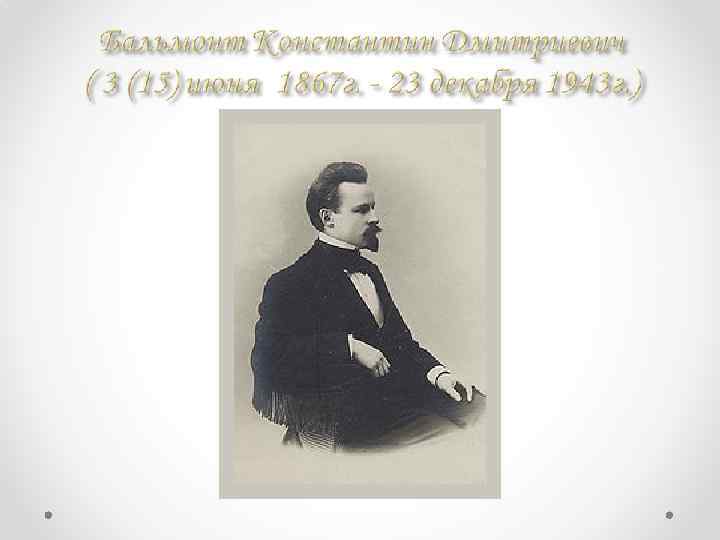 Константин Бальмонт поэт -символист, переводчик , эссеист, один из виднейших представителей русской поэзии Серебряного века. Опубликовал 35 поэтических сборников, 20 книг прозы, переводил с многих языков.