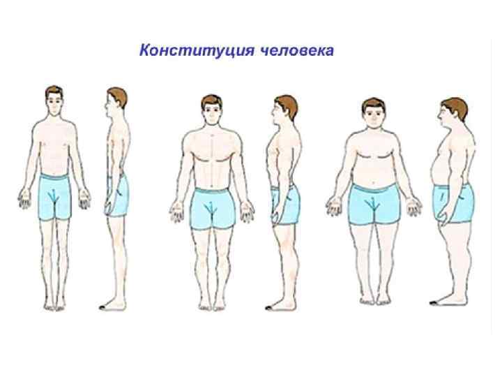 Соматотипы • астенический долихоморфные пропорции тела, слабая мускулатура, пониженное жироотложение; • нормос тенический— мезоморфные пропорции, среднее развитие мускулатуры и средняя степень жироотложения; • гиперстенический — брахиморфные пропорции тела, сильная мускулатура и зна чительное жироотложение.