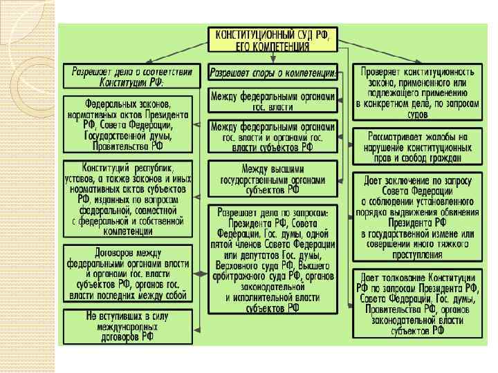 Компетенция Конституционного Суда РФ Проверка конституционности правовых актов в порядке абстрактного конституционного контроля (нормоконтроля); проверка конституционности законов в порядке конкретного конституционного контроля; разрешение споров о компетенции; официальное толкование Конституции РФ; дача заключения о соблюдении установленного порядка выдвижения обвинения Президента РФ в государственной измене или совершении иного тяжкого преступления; иные полномочия.