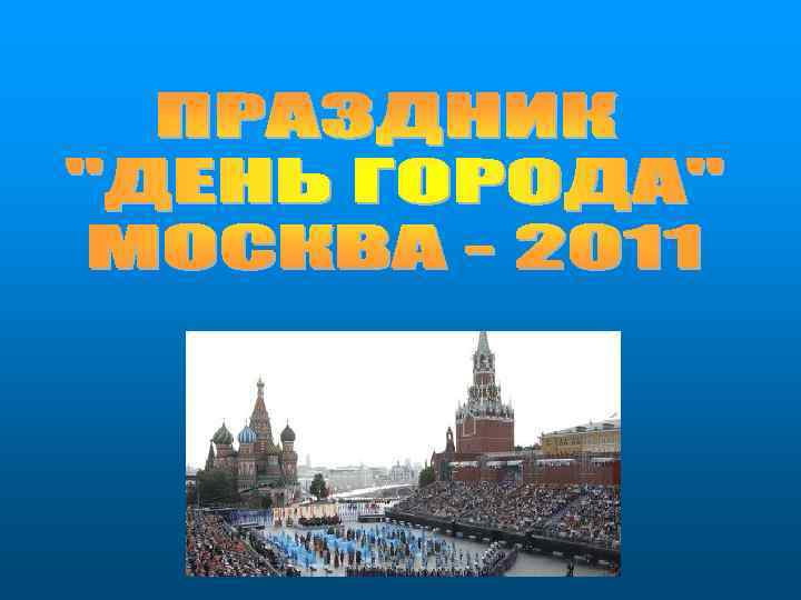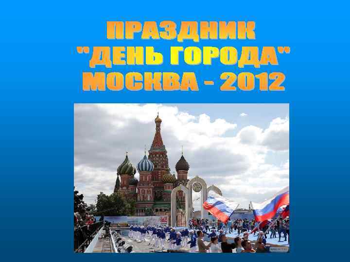 Празднование Дня города «Москва-865» началось с масштабного театрализованного представления на Красной площади «Москва – город любви. Эпоха в танце 1812 -2012» . «Разнообразие времен, стилей и музыки объединилось в двенадцать эпизодов истории Москвы. Полонезы и вальсы 1812 года, чествующие юбилей Бородинской битвы (200 лет), сменяет сцена открытия Московского цирка. Затем идёт революция и художественные театры, прославившие Москву на весь мир, парад трудящихся, песни и танцы военных 40 -х лет, стиляги и фестиваль молодежи и студентов, Гагарин и советское ретро. Потом Олимпиада 80 -х приветствует Сочи-2014, московские парки с их культурой танцевальных площадок и летних театров. Закрывают представление участники фестиваля «Спасская башня» , из журналистского репортажа