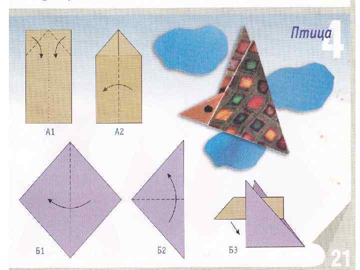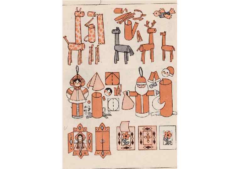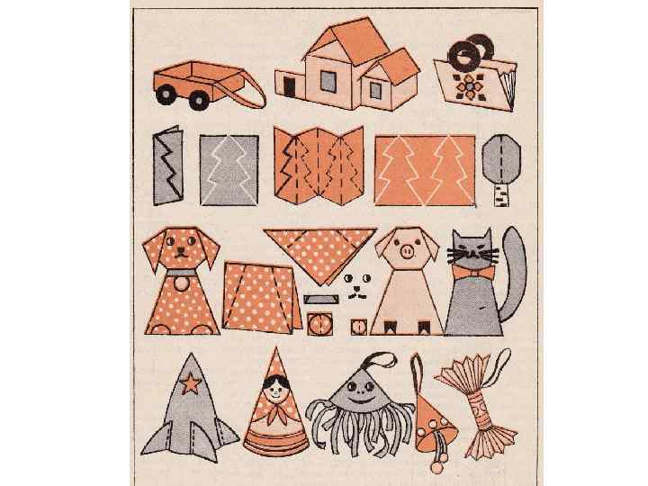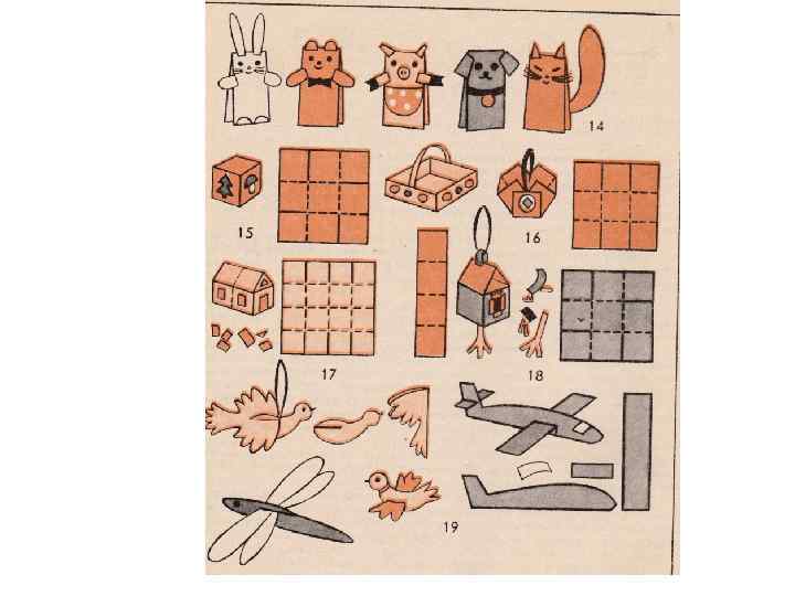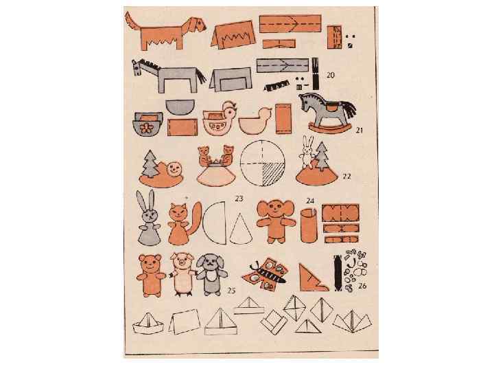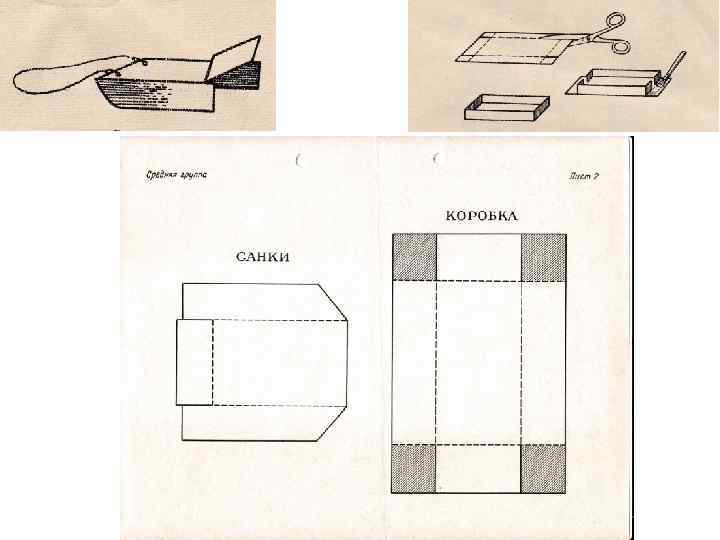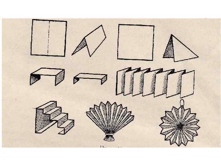 Складывание бумаги в разнообразных комбинациях -игрушки для игр с водой (лодочки) - для подвижных игр (вертушки, стрелы, самолеты) -для настольных игр (оригами) Использование выкроек -елочные игрушки - коробочки, домики и т. п