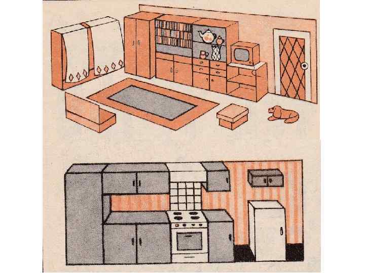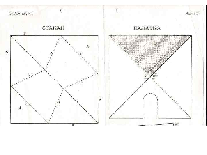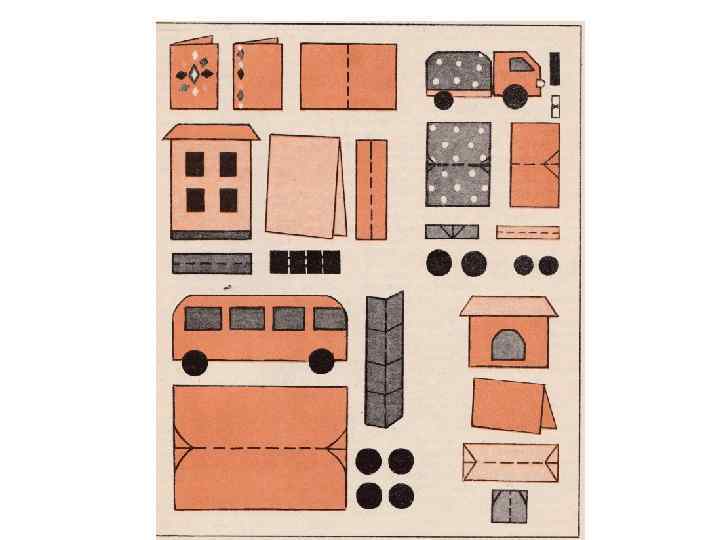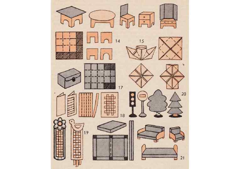 Конструирование из бумаги Сгибание листа пополам квадратный лист – шалаш, палатка прямоугольный лист – тетрадь, дом вагон Сгибание полос бумаги – мебель для кукол Сгибание, надрезание и склеивание квадратный лист сгибают на определенное количество равных частей, в нужных местах делают надрезы – кубик, стол, дом