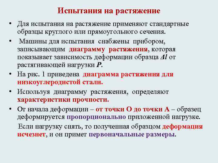 Испытания на растяжение • Для испытания на растяжение применяют стандартные образцы круглого или прямоугольного сечения. • Машины для испытания снабжены прибором, записывающим диаграмму растяжения, которая показывает зависимость деформации образца Δl от растягивающей нагрузки Р. • На рис. 1 приведена диаграмма растяжения для низкоуглеродистой стали. • Используя диаграмму растяжения, определяют характеристики прочности. • От начала деформации – от точки О до точки А – образец деформируется пропорционально приложенной нагрузке. Если нагрузку снять, то полученная образцом деформация исчезнет, и он примет первоначальные размеры.