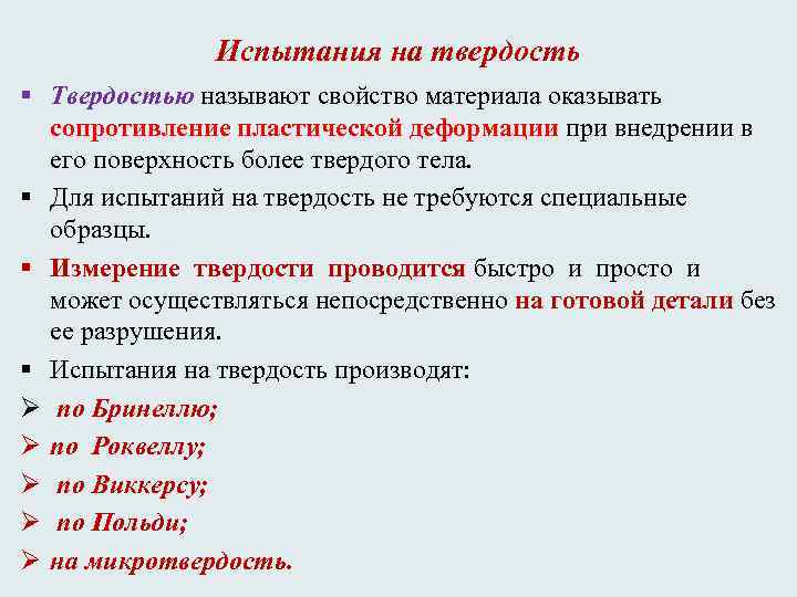 Испытания на твердость § Твердостью называют свойство материала оказывать сопротивление пластической деформации при внедрении в его поверхность более твердого тела. § Для испытаний на твердость не требуются специальные образцы. § Измерение твердости проводится быстро и просто и может осуществляться непосредственно на готовой детали без ее разрушения. § Испытания на твердость производят: Ø по Бринеллю; Ø по Роквеллу; Ø по Виккерсу; Ø по Польди; Ø на микротвердость.