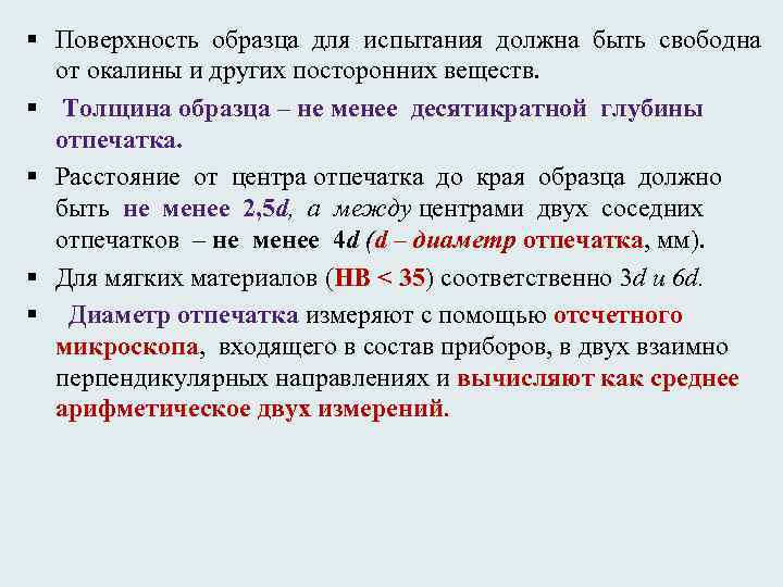 § Поверхность образца для испытания должна быть свободна от окалины и других посторонних веществ. § Толщина образца – не менее десятикратной глубины отпечатка. § Расстояние от центра отпечатка до края образца должно быть не менее 2, 5 d, а между центрами двух соседних отпечатков – не менее 4 d (d – диаметр отпечатка, мм). § Для мягких материалов (НВ < 35) соответственно 3 d и 6 d. § Диаметр отпечатка измеряют с помощью отсчетного микроскопа, входящего в состав приборов, в двух взаимно перпендикулярных направлениях и вычисляют как среднее арифметическое двух измерений.