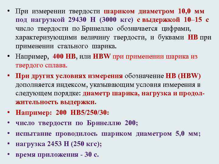 • При измерении твердости шариком диаметром 10, 0 мм под нагрузкой 29430 Н (3000 кгс) с выдержкой 10– 15 с число твердости по Бринеллю обозначается цифрами, характеризующими величину твердости, и буквами НВ применении стального шарика. • Например, 400 НВ, или HBW применении шарика из твердого сплава. • При других условиях измерения обозначение НВ (HBW) дополняется индексом, указывающим условия измерения в следующем порядке: диаметр шарика, нагрузка и продолжительность выдержки. • Например: 200 НВ 5/250/30: • число твердости по Бринеллю 200; • испытание проводилось шариком диаметром 5, 0 мм; • нагрузка 2453 Н (250 кгс); • время приложения - 30 с.
