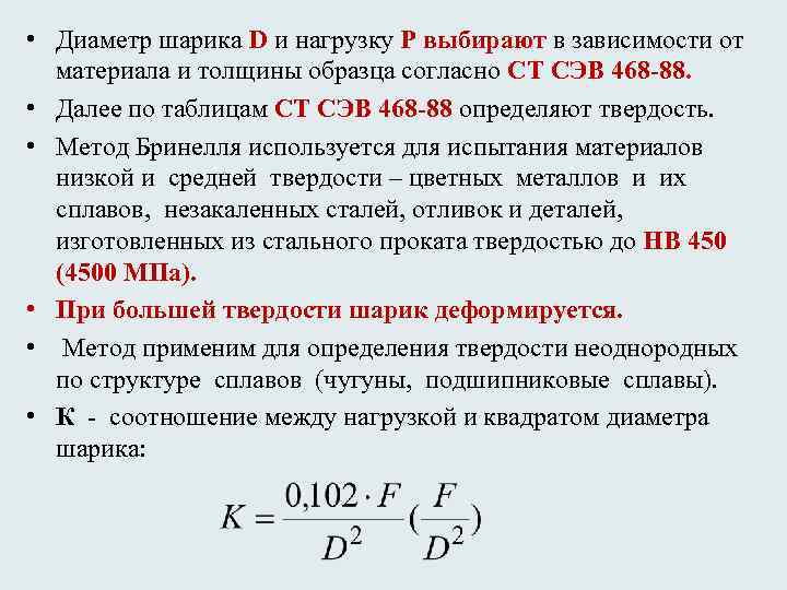 • Диаметр шарика D и нагрузку P выбирают в зависимости от материала и толщины образца согласно СТ СЭВ 468 -88. • Далее по таблицам СТ СЭВ 468 -88 определяют твердость. • Метод Бринелля используется для испытания материалов низкой и средней твердости – цветных металлов и их сплавов, незакаленных сталей, отливок и деталей, изготовленных из стального проката твердостью до HB 450 (4500 МПа). • При большей твердости шарик деформируется. • Метод применим для определения твердости неоднородных по структуре сплавов (чугуны, подшипниковые сплавы). • К - соотношение между нагрузкой и квадратом диаметра шарика: