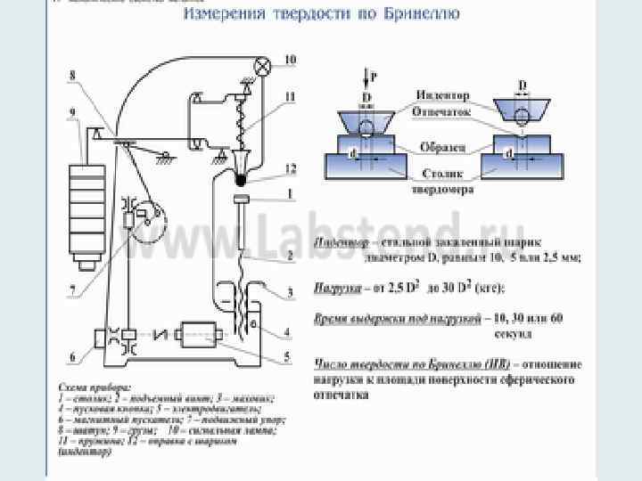 Измерение твердости по Бринеллю • При измерении твердости этим методом шарик из закаленной стали или твердого сплава вдавливается в испытуемый образец (изделие) под действием нагрузки, приложенной в течение определенного времени: Ø от 10 до 15 с для черных металлов; Ø от 10 до 180 с для цветных металлов. § Диаметры применяемых шариков 1, 0; 2, 5; 5 и 10 мм. § Нагрузка выбирается в пределах от 9, 8 Н (1 кгс) до 29420 Н (3000 кгс) в зависимости от вида металла или сплава.