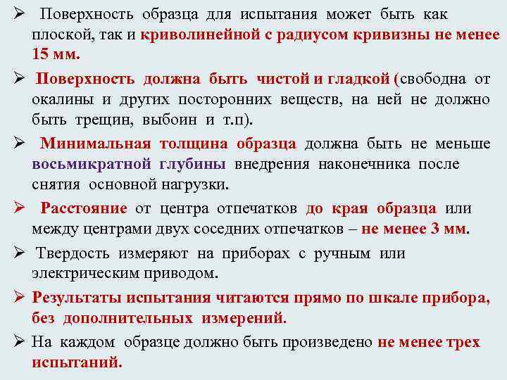 Ø Поверхность образца для испытания может быть как плоской, так и криволинейной с радиусом кривизны не менее 15 мм. Ø Поверхность должна быть чистой и гладкой (свободна от окалины и других посторонних веществ, на ней не должно быть трещин, выбоин и т. п). Ø Минимальная толщина образца должна быть не меньше восьмикратной глубины внедрения наконечника после снятия основной нагрузки. Ø Расстояние от центра отпечатков до края образца или между центрами двух соседних отпечатков – не менее 3 мм. Ø Твердость измеряют на приборах с ручным или электрическим приводом. Ø Результаты испытания читаются прямо по шкале прибора, без дополнительных измерений. Ø На каждом образце должно быть произведено не менее трех испытаний.