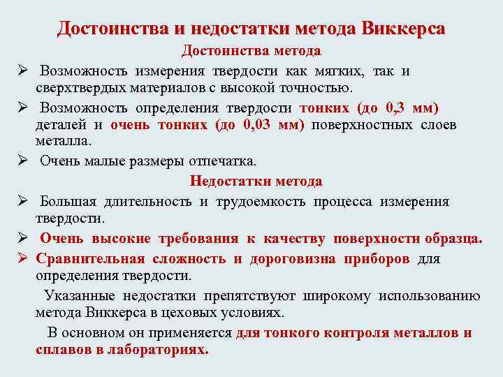 Достоинства и недостатки метода Виккерса Достоинства метода Ø Возможность измерения твердости как мягких, так и сверхтвердых материалов с высокой точностью. Ø Возможность определения твердости тонких (до 0, 3 мм) деталей и очень тонких (до 0, 03 мм) поверхностных слоев металла. Ø Очень малые размеры отпечатка. Недостатки метода Ø Большая длительность и трудоемкость процесса измерения твердости. Ø Очень высокие требования к качеству поверхности образца. Ø Сравнительная сложность и дороговизна приборов для определения твердости. Указанные недостатки препятствуют широкому использованию метода Виккерса в цеховых условиях. В основном он применяется для тонкого контроля металлов и сплавов в лабораториях.