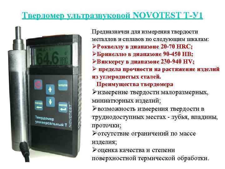 Твердомер ультразвуковой NOVOTEST Т-У 1 Предназначен для измерения твердости металлов и сплавов по следующим шкалам: ØРоквеллу в диапазоне 20 -70 HRC; ØБринеллю в диапазоне 90 -450 HB; ØВиккерсу в диапазоне 230 -940 HV; Ø предела прочности на растяжение изделий из углеродистых сталей. Преимущества твердомера Øизмерение твердости малоразмерных, миниатюрных изделий; Øвозможность измерения твердости в труднодоступных местах - зубья, впадины, проточки; Øотсутствие ограничений по массе изделия; Øоценка качества и степени поверхностной термической обработки.