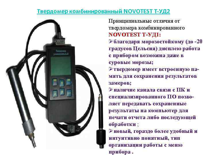 Твердомер комбинированный NOVOTEST Т-УД 2 Принципиальные отличия от твердомера комбинированного NOVOTEST Т-УД 1: Øблагодаря морозостойкому (до -20 градусов Цельсия) дисплею работа с прибором возможна даже в суровые морозы; Øтвердомер имеет встроенную память для сохранения результатов замеров; Øналичие канала связи с ПК и специализированного ПО позволяет передавать сохраненные результаты на компьютер для печати отчета либо последующей обработки ; Øновый, гораздо более удобный и интуитивно понятный, тип организации работы с меню прибора.
