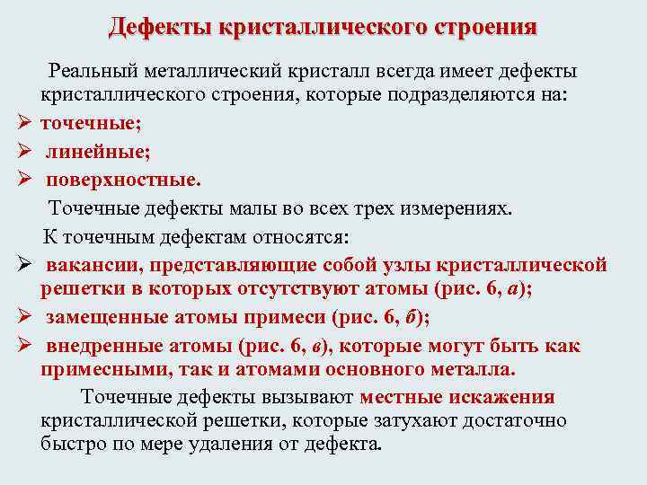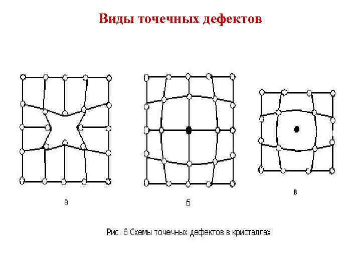 Дефекты кристаллического строения Реальный металлический кристалл всегда имеет дефекты кристаллического строения, которые подразделяются на: Ø точечные; Ø линейные; Ø поверхностные. Точечные дефекты малы во всех трех измерениях. К точечным дефектам относятся: Ø вакансии, представляющие собой узлы кристаллической решетки в которых отсутствуют атомы (рис. 6, а); Ø замещенные атомы примеси (рис. 6, б); Ø внедренные атомы (рис. 6, в), которые могут быть как примесными, так и атомами основного металла. Точечные дефекты вызывают местные искажения кристаллической решетки, которые затухают достаточно быстро по мере удаления от дефекта.