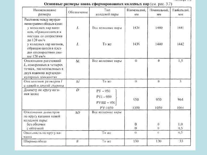Основные размеры Колёса на ось прочно запрессовывают в холодном состоянии с соблюдением строго определённого расстояния между ними. Расстояние между внутренними гранями колёс составляет: для новых колёсных пар, предназначенных для скоростей движения: до 120 кмч - 1440 +1 -2 мм; свыше 120, но не более 140 кмч – 1440 +2 – 1 мм. Нижнее отклонение уменьшено до минус 1 мм, для уменьшения зазора между гребнем колеса и рельсом, что способствует уменьшению боковых нагрузок и повышению плавности хода. В условиях эксплуатации предусматриваются определённые допуски износа гребней по толщине. Так, для пассажирских вагонов, эксплуатирующихся в поездах со скоростью от 120 до 140 кмч, минимальное значение толщины гребня допускается 28 мм, против альбомного 33 мм. Во избежание неравномерной передачи нагрузки на колёса разность размеров от торца оси до внутренней грани обода допускается для колёсной пары не более 3 мм. Колёса, запрессованные на одну ось, не должны иметь разность по диаметру D более 1 мм.