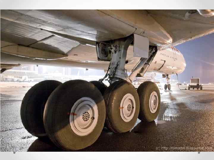 • С помощью шасси самолёт осуществляет взлёт и посадку, руление, стоянку. Шасси представляет собой демпферную стойку, к которой крепится колёсная тележка (у гидропланов — поплавок). В зависимости от массы самолёта различается конфигурация шасси. Наиболее часто встречающиеся: одна передняя стойка и две основных (Ту-154, А 320), одна передняя и три основных (Ил-96), одна передняя и четыре основных (Боинг 747), две передних и две основных (B-52) • Управление поворотом самолёта на земле может осуществляться через привод к передней стойке шасси или дифференциацией режима работы двигателей (у самолётов с более чем одним двигателем). В полёте шасси убираются в специальные отсеки для уменьшения аэродинамического сопротивления.