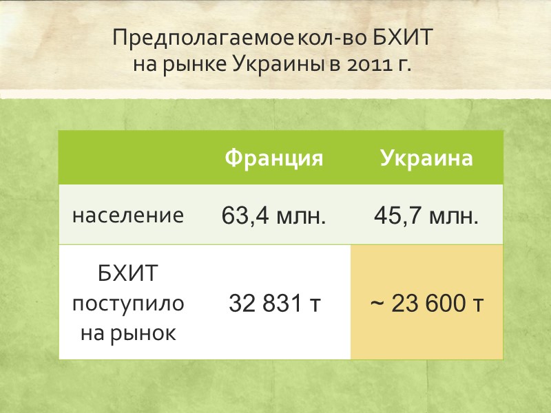 Предполагаемое кол-во БХИТ на рынке Украины в 2011 г.