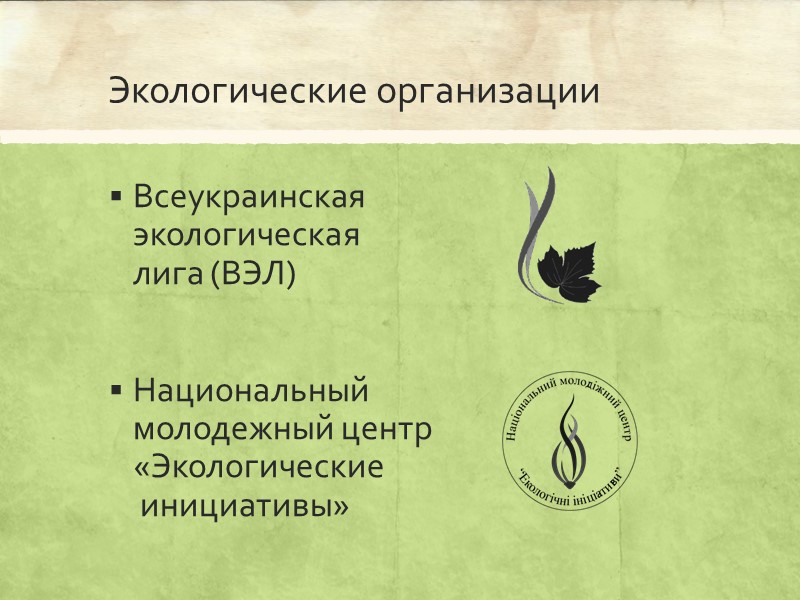 Экологические организации Всеукраинская экологическая лига (ВЭЛ) Национальный молодежный центр «Экологические инициативы»