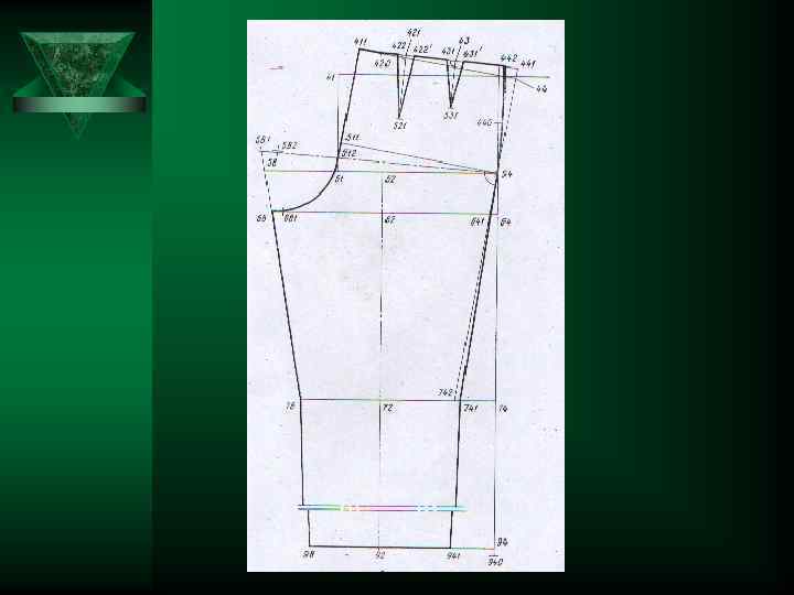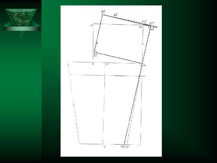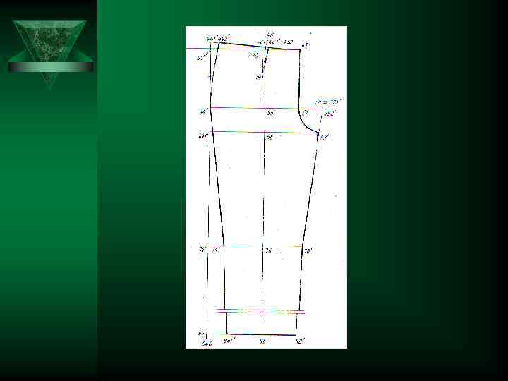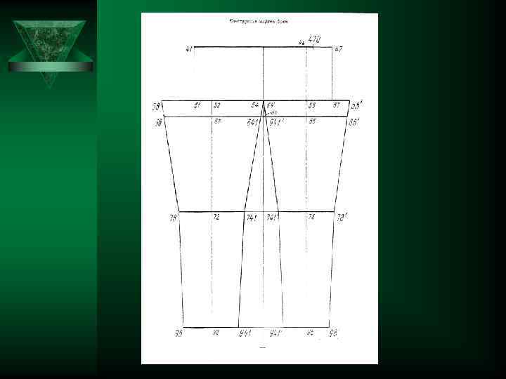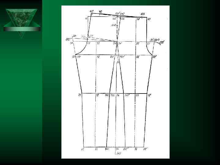 9 Расстояние от пола до линии колена 9 Вверх по вертикали 40 -74 10 Расстояние от пола до линии низа брюк 40 -94 0, 04*Т 1 11 Ширина шага задней части брюк 51 -58 Т 19 - Т 9+П 9 Вверх по вертикали. Из 94, 74, 64 горизонтали вправо и влево 0, 665(0, 2* Влево по горизонтали -2)+П 12 Ширина шага передней части брюк 0, 335(0, 2 57 -58* Т 19 - Вправо по горизонтали -2)+П 13 Расстояние от шаговой линии до сгиба задней части брюк на линии бёдер 0, 58 -52 5(/58 -51/+ +/51 -54/) Вправо по горизонтали. Из 52 вертикаль вниз до пересечения с линиями подъягодичной складки, колена, низа соответственно в точках 62, 72, 92 14 Расстояние от боковой линии до сгиба передней части брюк на линии бёдер 54*-56 0, 5(/54*-57/+ +/57 -58/) Вправо по горизонтали. Из 56 вертикаль вверх и вниз до пересечения с линией талии, подъягодичной складки, колена, низа соответственно в точках 46, 66, 76, 96. 15 Расстояние от сгиба до шаговой линии задней части брюк на линии колена 72 -78 0, 275(Т 22+П) Влево по горизонтали 16 Расстояние от сгиба до боковой линии задней части брюк на линии колена 72 -741 0, 275(Т 22+П) Вправо по горизонтали