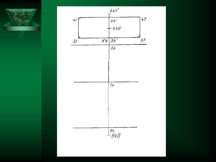 РАСЧЁТ БК ЖЕНСКИХ БРЮК Номер системы 1 Наименование отрезка 2 Обозначение отрезка 3 Формула 4 1 2 Расстояние от линии талии до линии бёдер 41 -51 0, 65(Т 7 -Т 12)-2+П Ширина брюк на линии бёдер 51 -57 0, 5 Т 19+П 3 Ширина задней части брюк на линии бёдер 51 -54 0, 53/51 -57/ Расчёт М 1: 2 5 Способ откладывания 6 Вниз по вертикали Вправо по горизонтали То же Из 57 вертикаль вверх до пересечения с горизонталью из 41 -точка 47. Из 54 вертикаль вверх и вниз, пересечение с горизонталью из 41 -точка 44* Ширина передней части брюк на линии бёдер 54*-57 0, 47/51 -57/ 5 Расстояние от линии талии до пола спереди 44*-940 Т 26 -2+П Вниз по вертикали 6 Расстояние от пола до линии талии сбоку 940 -441* Т 25 -2+П Вверх по вертикали 7 Расстояние от пола до остисто-подвздошной передней точки сбоку 940 -440 Т 8+П То же 8 Расстояние от пола до линии промежности 940 -64 Т 27+П+1, 5 То же 4