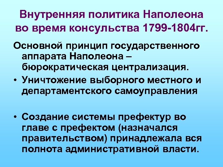 Внутренняя политика Наполеона во время консульства 1799 -1804 гг. Основной принцип государственного аппарата Наполеона – бюрократическая централизация. • Уничтожение выборного местного и департаментского самоуправления • Создание системы префектур во главе с префектом (назначался правительством) принадлежала вся полнота административной власти.
