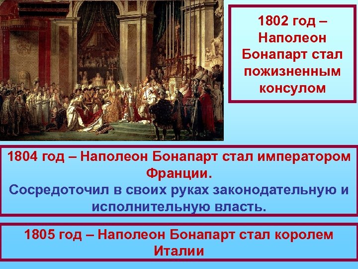 1802 год – Наполеон Бонапарт стал пожизненным консулом 1804 год – Наполеон Бонапарт стал императором Франции. Сосредоточил в своих руках законодательную и исполнительную власть. 1805 год – Наполеон Бонапарт стал королем Италии