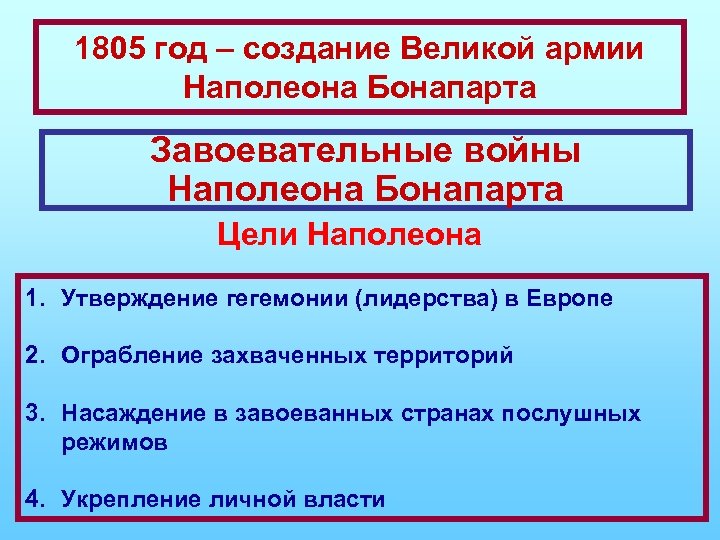 1805 год – создание Великой армии Наполеона Бонапарта Завоевательные войны Наполеона Бонапарта Цели Наполеона 1. Утверждение гегемонии (лидерства) в Европе 2. Ограбление захваченных территорий 3. Насаждение в завоеванных странах послушных режимов 4. Укрепление личной власти