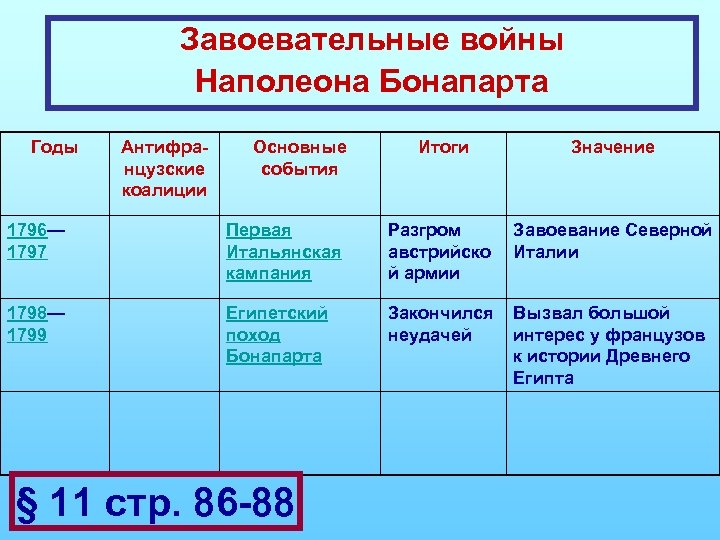 Завоевательные войны Наполеона Бонапарта Годы Антифранцузские коалиции Основные события Итоги Значение Завоевание Северной Италии 1796— 1797 Первая Итальянская кампания Разгром австрийско й армии 1798— 1799 Египетский поход Бонапарта Закончился Вызвал большой неудачей интерес у французов к истории Древнего Египта § 11 стр. 86 -88