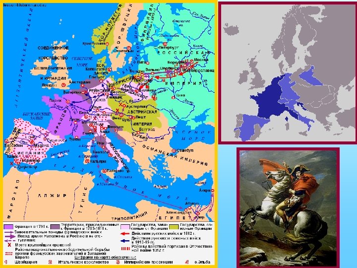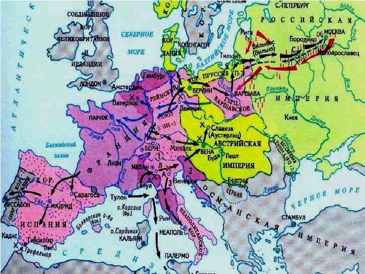 Завоевательные войны Наполеона Бонапарта 1. 2. 3. 4. 5. 6. 7. 8. 9. 10. 11. 12. 1796— 1797 гг. - Первая Итальянская кампания 1798— 1799 гг. - Египетский поход Бонапарта 1800 г. - Вторая Итальянская кампания 1805 г. - Первая Австрийская кампания 1806 г. - Прусская кампания 1806— 1807 гг. - Польская кампания 1807— 1814 гг. - Испано. Португальская кампания 1809 г. - Вторая Австрийская кампания 1812 г. - Русская кампания 1813 г. - Саксонская кампания 1814 г. - Битва за Францию 1815 г. - Бельгийская кампания Антифранцузские коалиции 1. 2. 3. 4. 5. 6. 7. 1793— 1797 гг. - I антифранцузская коалиция. Россия, Англия и Австрия 1799— 1802 гг. - II антифранцузская коалиция. Россия, Австрия, Османская империя, Англия и Неаполитанское королевство. 1. Итальянский поход 1799 г. 2. Швейцарский поход 1799 г. 1805 г. - III антифранцузская коалиция. Россия, Англия, Австрия, Швеция и Сицилия. 1806— 1807 гг. - IV антифранцузская коалиция. Англия, Швеция, Пруссия, Саксония и Россия. 1809 г. - V антифранцузская коалиция. Австрия, Англия и Испания 1812— 1814 гг. - VI антифранцузская коалиция. Россия, Англия, Испания, Австрия и Пруссия 1815 г. - VII антифранцузская коалиция. «Сто дней» Наполеона Англия, Голландия, Пруссия.