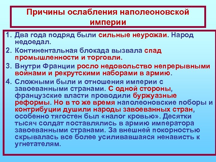 Причины ослабления наполеоновской империи 1. Два года подряд были сильные неурожаи. Народ недоедал. 2. Континентальная блокада вызвала спад промышленности и торговли. 3. Внутри Франции росло недовольство непрерывными войнами и рекрутскими наборами в армию. 4. Сложными были и отношения империи с завоеванными странами. С одной стороны, французские власти проводили буржуазные реформы. Но в то же время наполеоновские поборы и контрибуции душили народы завоеванных стран, особенно тягостен был «налог кровью» . Десятки тысяч солдат поставлялись в армию императора завоеванными странами. За внешней покорностью скрывалась все более усиливавшаяся ненависть к угнетателям.