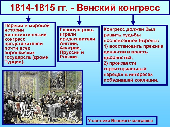 1814 -1815 гг. - Венский конгресс Первый в мировой истории дипломатический конгресс представителей почти всех европейских государств (кроме Турции). Главную роль играли представители Англии, Австрии, Пруссии и России. Конгресс должен был решить судьбы послевоенной Европы: 1) восстановить прежние династии и власть дворянства, 2) произвести территориальный передел в интересах победившей коалиции. Участники Венского конгресса