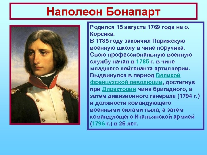 Наполеон Бонапарт Родился 15 августа 1769 года на о. Корсика. В 1785 году закончил Парижскую военную школу в чине поручика. Свою профессиональную военную службу начал в 1785 г. в чине младшего лейтенанта артиллерии. Выдвинулся в период Великой французской революции, достигнув при Директории чина бригадного, а затем дивизионного генерала (1794 г. ) и должности командующего военными силами тыла, а затем командующего Итальянской армией (1796 г. ) в 26 лет.