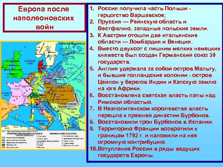 Европа после наполеоновских войн 1. Россия получила часть Польши - герцогство Варшавское; 2. Пруссия — Рейнскую область и Вестфалию, западные польские земли. 3. К Австрии отошли две итальянские области — Ломбардия и Венеция. 4. Вместо двухсот с лишним мелких немецких княжеств был создан Германский союз 39 государств. 5. Англия удержала за собой остров Мальту, и бывшие голландские колонии - остров Цейлон у берегов Индии и Капскую землю на юге Африки. 6. Восстановлена светская власть папы над Римской областью. 7. В Неаполитанском королевстве власть перешла к прежней династии Бурбонов. 8. Восстановили трон Бурбонов в Испании. 9. Территорию Франции возвратили к границам 1792 г. и наложили на нее огромную контрибуцию. 10. Вступление России в ряды ведущих государств Европы.