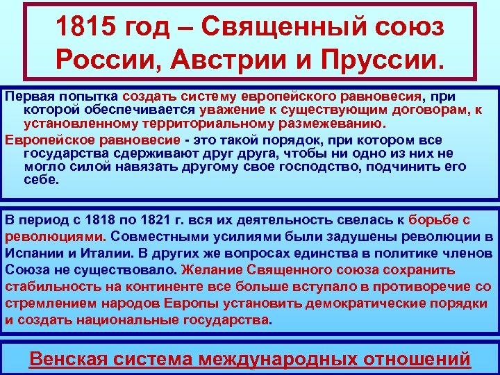 1815 год – Священный союз России, Австрии и Пруссии. Первая попытка создать систему европейского равновесия, при которой обеспечивается уважение к существующим договорам, к установленному территориальному размежеванию. Европейское равновесие - это такой порядок, при котором все государства сдерживают друга, чтобы ни одно из них не могло силой навязать другому свое господство, подчинить его себе. В период с 1818 по 1821 г. вся их деятельность свелась к борьбе с революциями. Совместными усилиями были задушены революции в Испании и Италии. В других же вопросах единства в политике членов Союза не существовало. Желание Священного союза сохранить стабильность на континенте все больше вступало в противоречие со стремлением народов Европы установить демократические порядки и создать национальные государства. Венская система международных отношений