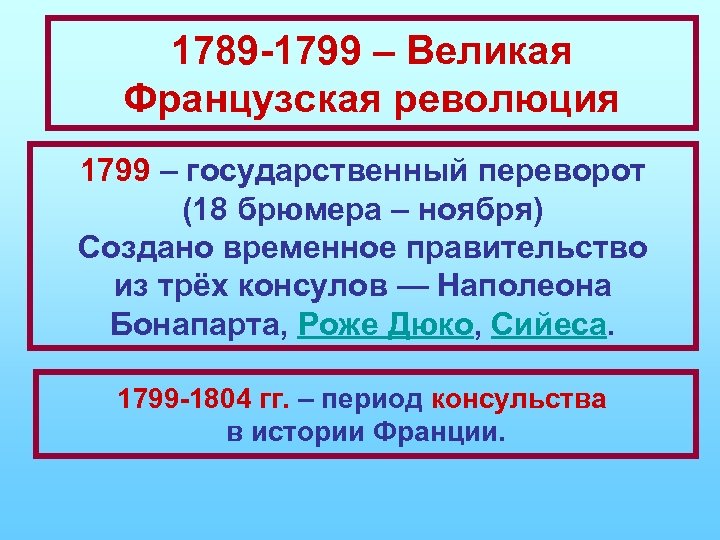 1789 -1799 – Великая Французская революция 1799 – государственный переворот (18 брюмера – ноября) Создано временное правительство из трёх консулов — Наполеона Бонапарта, Роже Дюко, Сийеса. 1799 -1804 гг. – период консульства в истории Франции.