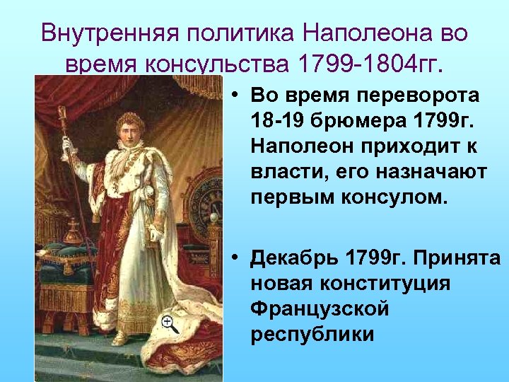 Внутренняя политика Наполеона во время консульства 1799 -1804 гг. • Во время переворота 18 -19 брюмера 1799 г. Наполеон приходит к власти, его назначают первым консулом. • Декабрь 1799 г. Принята новая конституция Французской республики