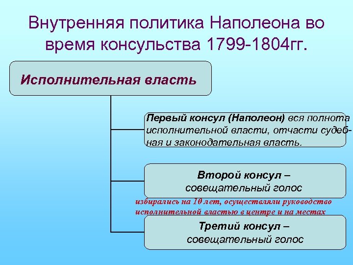 Внутренняя политика Наполеона во время консульства 1799 -1804 гг. Исполнительная власть Первый консул (Наполеон) вся полнота исполнительной власти, отчасти судебная и законодательная власть. Второй консул – совещательный голос избирались на 10 лет, осуществляли руководство исполнительной властью в центре и на местах Третий консул – совещательный голос