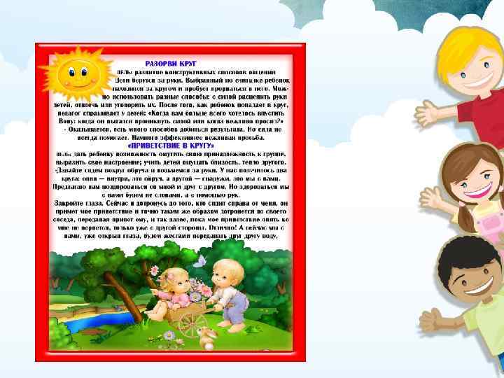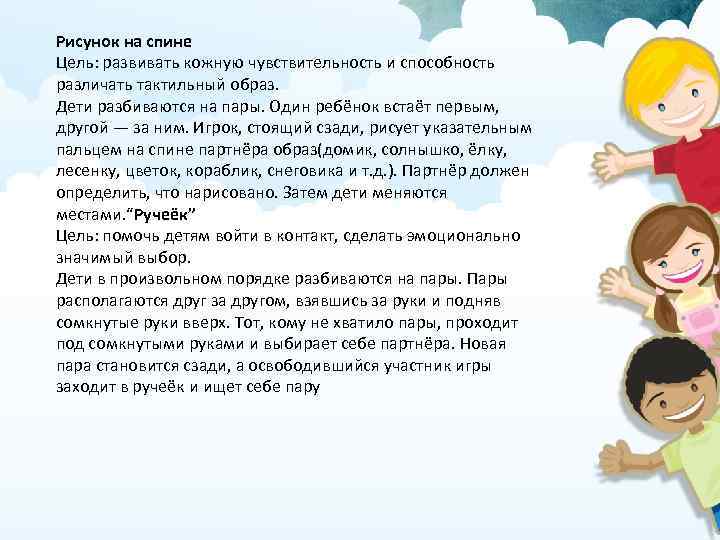 Рисунок на спине Цель: развивать кожную чувствительность и способность различать тактильный образ. Дети разбиваются на пары. Один ребёнок встаёт первым, другой — за ним. Игрок, стоящий сзади, рисует указательным пальцем на спине партнёра образ(домик, солнышко, ёлку, лесенку, цветок, кораблик, снеговика и т. д. ). Партнёр должен определить, что нарисовано. Затем дети меняются местами. “Ручеёк” Цель: помочь детям войти в контакт, сделать эмоционально значимый выбор. Дети в произвольном порядке разбиваются на пары. Пары располагаются друг за другом, взявшись за руки и подняв сомкнутые руки вверх. Тот, кому не хватило пары, проходит под сомкнутыми руками и выбирает себе партнёра. Новая пара становится сзади, а освободившийся участник игры заходит в ручеёк и ищет себе пару