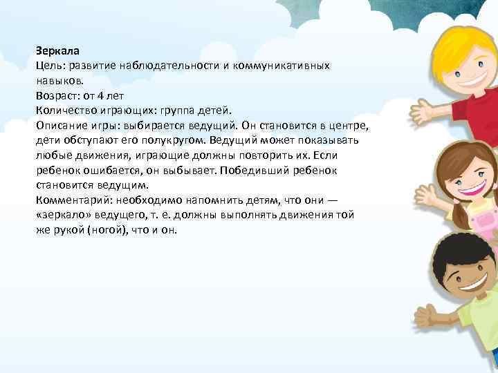 Зеркала Цель: развитие наблюдательности и коммуникативных навыков. Возраст: от 4 лет Количество играющих: группа детей. Описание игры: выбирается ведущий. Он становится в центре, дети обступают его полукругом. Ведущий может показывать любые движения, играющие должны повторить их. Если ребенок ошибается, он выбывает. Победивший ребенок становится ведущим. Комментарий: необходимо напомнить детям, что они — «зеркало» ведущего, т. е. должны выполнять движения той же рукой (ногой), что и он.