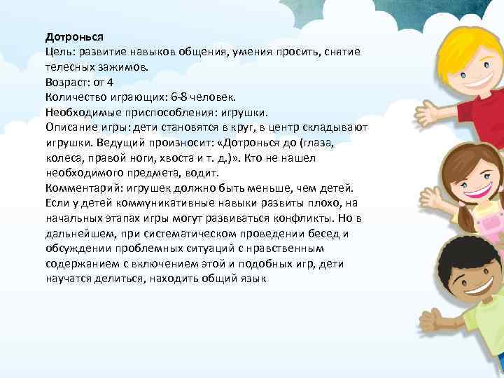 Дотронься Цель: развитие навыков общения, умения просить, снятие телесных зажимов. Возраст: от 4 Количество играющих: 6 -8 человек. Необходимые приспособления: игрушки. Описание игры: дети становятся в круг, в центр складывают игрушки. Ведущий произносит: «Дотронься до (глаза, колеса, правой ноги, хвоста и т. д. )» . Кто не нашел необходимого предмета, водит. Комментарий: игрушек должно быть меньше, чем детей. Если у детей коммуникативные навыки развиты плохо, на начальных этапах игры могут развиваться конфликты. Но в дальнейшем, при систематическом проведении бесед и обсуждении проблемных ситуаций с нравственным содержанием с включением этой и подобных игр, дети научатся делиться, находить общий язык