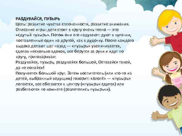 РАЗДУВАЙСЯ, ПУЗЫРЬ Цель: развитие чувства сплоченности, развитие внимания. Описание игры: дети стоят в кругу очень тесно — это «сдутый пузырь» . Потом они его надувают: дуют в кулачки, поставленные один на другой, как в дудочку. После каждого выдоха делают шаг назад — «пузырь» увеличивается, сделав несколько вдохов, все берутся за руки и идут по кругу, приговаривая: Раздувайся, пузырь, раздувайся большой, Оставайся такой, да не лопайся! Получается большой круг. Затем воспитатель (или кто-то из детей, выбранный ведущим) говорит: «Хлоп!» — «пузырь» лопается, все сбегаются к центру ( «пузырь» сдулся) или разбегаются по комнате (разлетелись пузырьки).