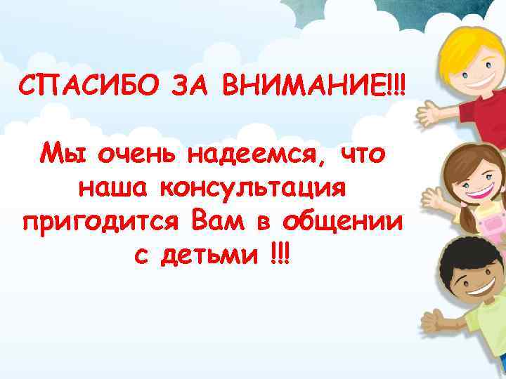 СПАСИБО ЗА ВНИМАНИЕ!!! Мы очень надеемся, что наша консультация пригодится Вам в общении с детьми !!!