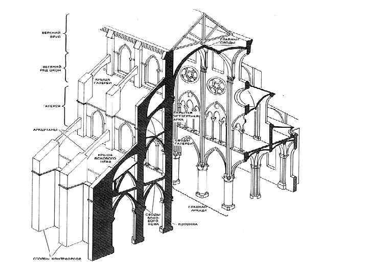 места, где каменные швы с тяжестью упирались в стены, нужно было укреплять: к ним снаружи пристраивали дополнительные опоры – подпружные арки, которые своей распирающей силой давили навстречу распирающей силе свода и этим поддерживали стены