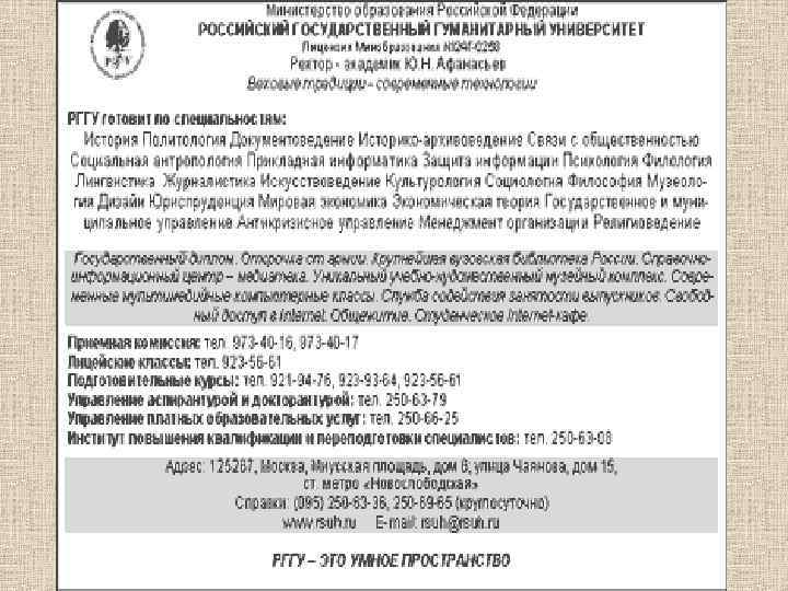 Основной текст – это прямое перечисление предлагаемых продуктов, услуг по образованию. Иногда услуги по обучению представляются в порядке их значимости. Основной рекламный текст содержит наименование специальностей, собственно образовательные услуги, условия их предоставления и дополнительную информацию, подчеркивающую их потребительские преимущества. В конце рекламного текста, как правило, содержится предложение потребителям, как и где именно они могут воспользоваться предлагаемыми услугами. Венчает текст эхо-фраза: "РГГУ – это умное пространство".
