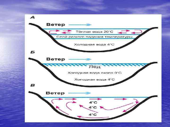 Tемпературная дихотомия • Температурная дихотомия и плотностная стратификация воды. • Весной холодная поверхностная вода нагревается до 4°С и, становясь наиболее плотной, начинает погружаться вглубь, а на ее место снизу поднимается менее плотная вода. В результате возникшей циркуляции в водоеме наступает гомотермия, когда температура во всей массе воды становится одинаковой, равной 4°С. С дальнейшим повышением температуры поверхностные воды, становясь менее плотными, не погружаются вглубь и постепенно прогреваются все больше, так что температурная дихотомия усиливается. Наступает летняя стагнация. Осенью поверхностные воды, охлаждаясь и становясь более плот ными, начинают опускаться вглубь, и процесс перемешивания идет до тех пор, пока не наступит новая, осенняя гомотермия. Ког да поверхностные воды начнут охлаждаться ниже 4°С, они как менее плотные больше не опускаются вглубь, осенняя циркуляция заканчивается, и в водоеме снова устанавливается температурная дихотомия. Наступает зимняя стагнация.
